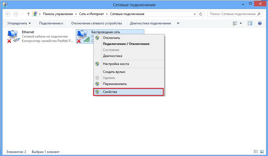 5. Выберите нужное сетевое подключение "Подключение по локальной сети" (Ethernet) или "Беспроводная сеть" (Wi-Fi) и нажмите на нём правой кнопкой мышки, выберите "Свойства":