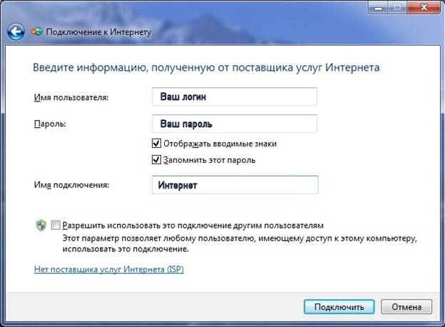 7. Введите "Логин" и "Пароль" (посмотрите их в листе настроек) и "Имя подключения" (например "Интернет"). Установите галочку "Запомнить этот пароль" и нажмите "Подключить":